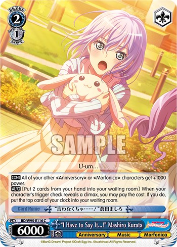 [CONT] All of your other "Anniversary" or "Morfonica" characters get +1000 power. [AUTO] [Put 2 cards from your hand into your waiting room] When your character's trigger check reveals a climax, you may pay the cost. If you do, put the top card of your clock into your waiting room.